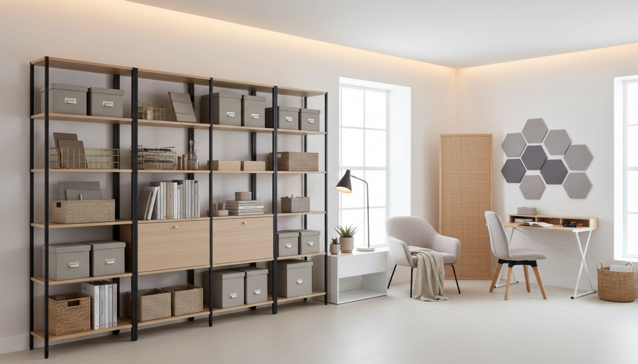 - Ażurowe regały: Wysoki, otwarty regał ustawiony prostopadle do ściany stworzy intymny kącik do pracy, nie zabierając przy tym cennego światła dziennego.